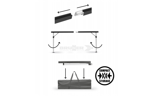 Il tavolo con piano arrotolabile Quadra Compack 4 si distingue per la struttura del telaio divisibile di nuova concezione, che consente di ridurre notevolmente le dimensioni dell'imballaggio e si adatta quindi alle particolari esigenze di spazio di minibus, van e camper furgonati. Rispetto al Quadra Classic, la stabilità, la funzionalità e l'aspetto rimangono invariati.